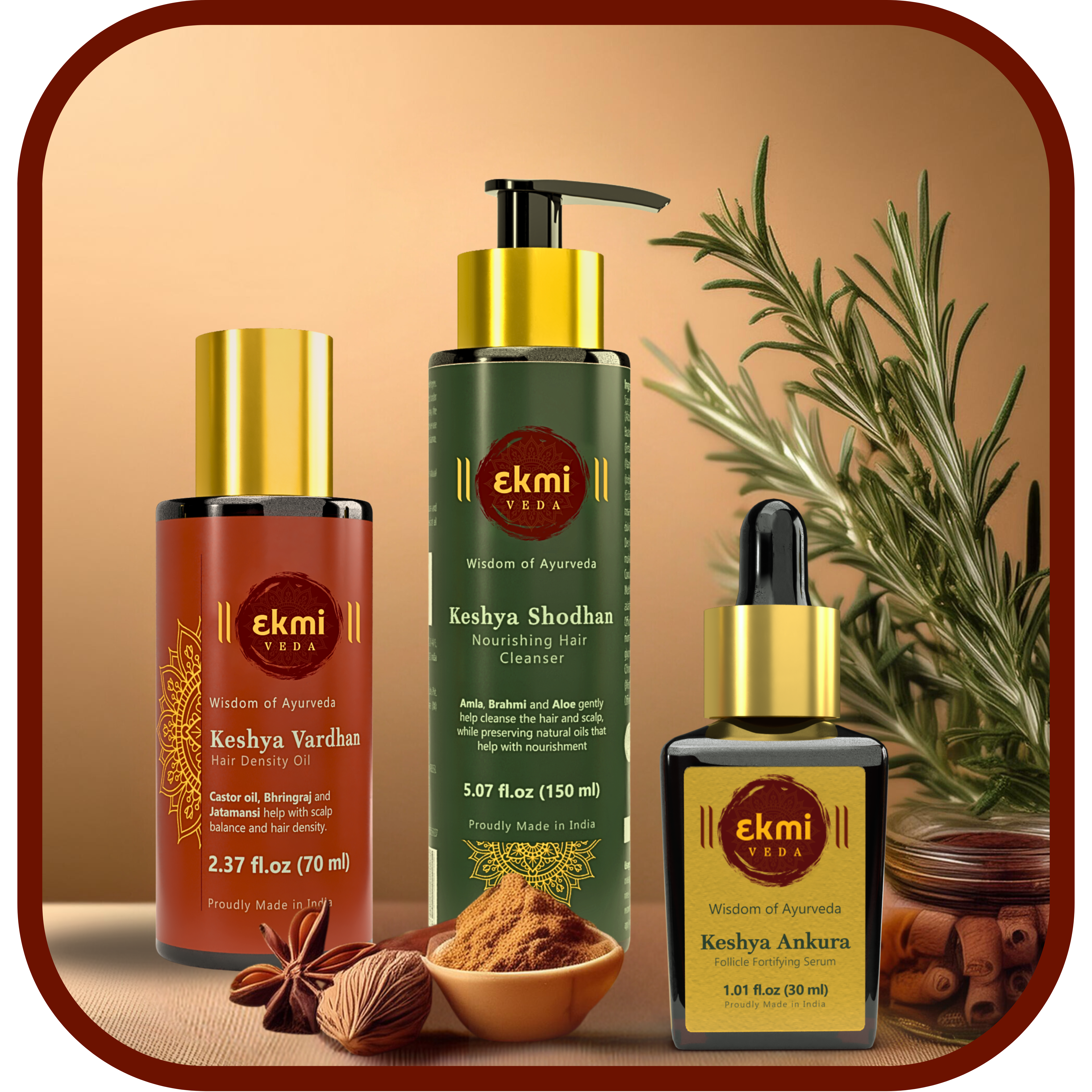 Ekmiveda's 3-step customized regime includes an Ayurvedic hair density oil (pre-wash), Ayurvedic shampoo (cleanser) and a hair serum. All three products have hair growth properties, but the most effective result is only observable on usage of all 3 products cumulatively.